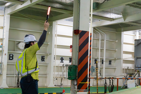 船内の作業進捗を把握しながら、トラクタヘッドへ船内進入の合図を出したり、また船内から連結されたトレーラを船外へ搬出する合図指示を行います。作業進捗を見極める、熟知した作業責任者です。