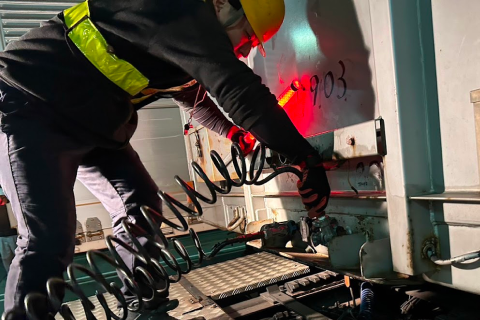 船内に搬送された大型トレーラの車両をラッシングベルト、ウェッジ、台車を使用し、船体と車両を固定する作業です。輸送中にトレーラが動かない様にする、とても重要な作業になります。